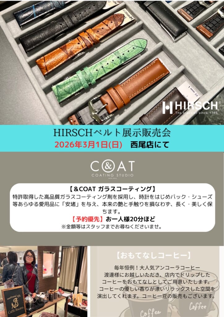 高品質、高性能として人気の高いオーストリアメイドの革ベルト「ヒルシュ」の展示販売会を3月1日(日) AMI西尾店にて開催致します。