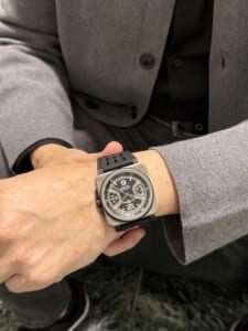 3時位置のデイト表示と9時位置のパワーリザーブはマットグレーで縁取られ対照的なデザインの美学を感じます。