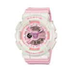[ SPEC ]カタログ番号 0000007392 サイズ 43.4mm 文字盤 ピンク 機能 デジタル+アナログ インデックス バー ケース素材 ポリカーボネート ベルト 樹脂バンド ベゼル ノーマル 日付 日付あり 防水性 100M 動力 クォーツ アクティブな女性に向けた耐衝撃・カジュアルウオッチBABY-Gから、柔らかなパステルカラーを纏ったデザインで日常に彩りを添えるモデルです。掲載されている商品はラインナップのご紹介となっております。