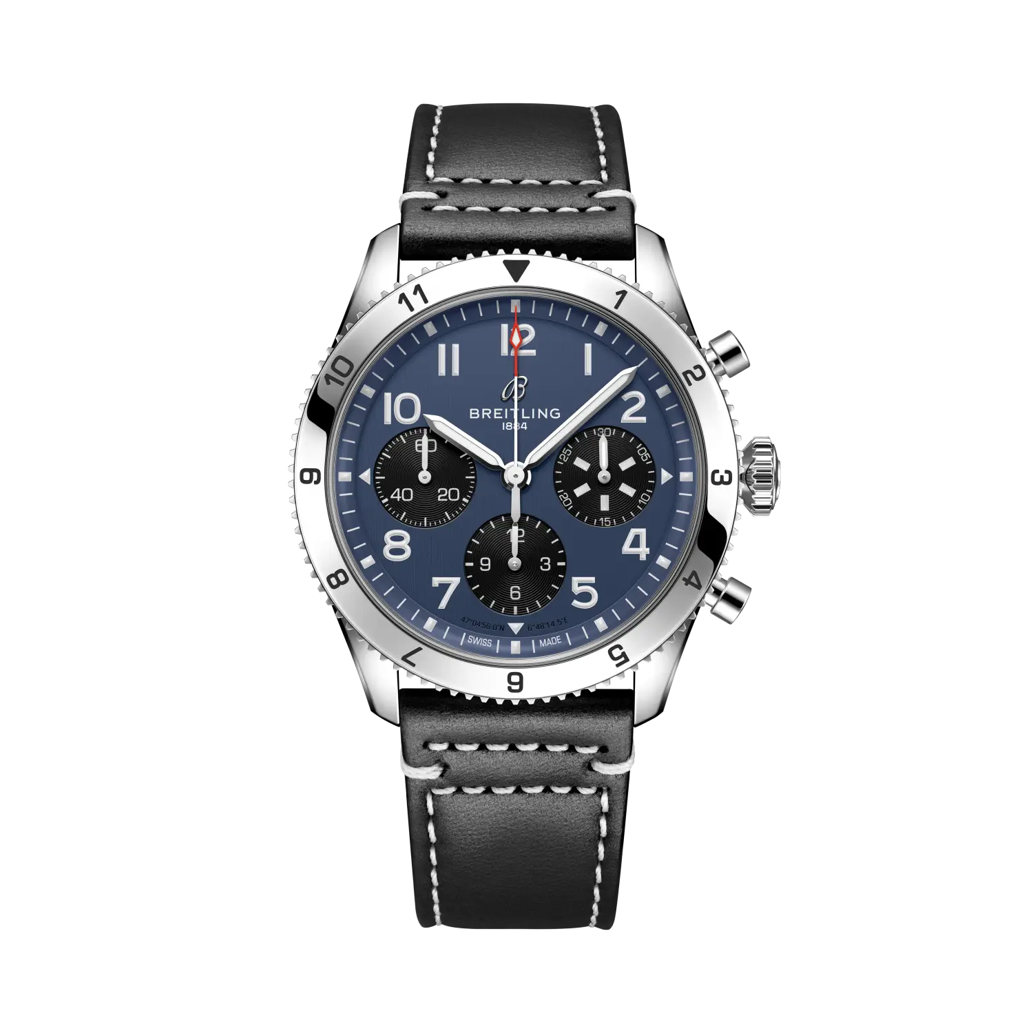 [ SPEC ]掲載されている商品はラインナップのご紹介となっております。カタログ番号 0000006890 サイズ 42mm 文字盤 ブルー 機能 クロノグラフ インデックス アラビア ケース素材 ステンレススチール ベルト カーフストラップ ベゼル 回転ベゼル 日付 日付なし 防水性 100M 動力 自動巻き