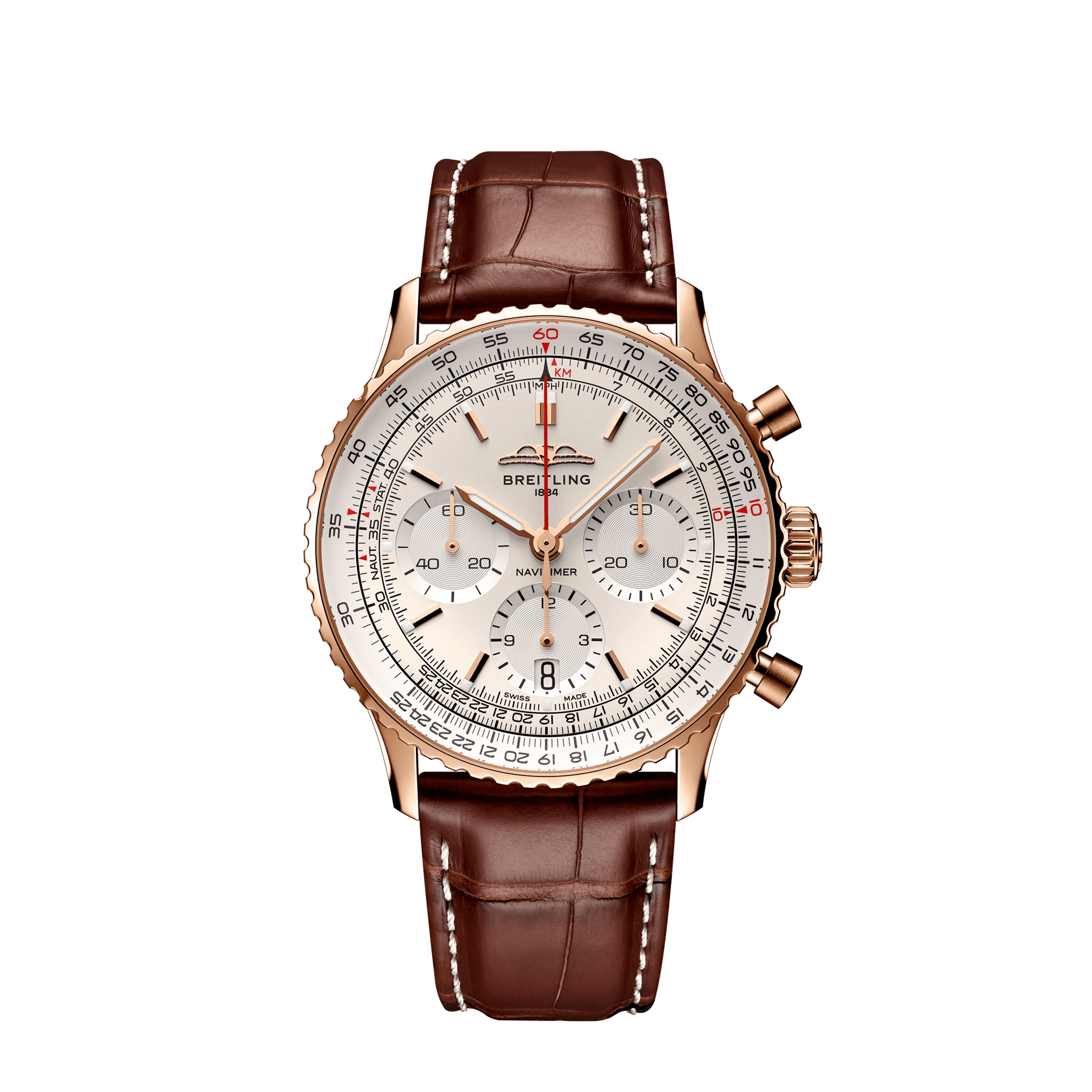[ SPEC ]カタログ番号 0000000812 サイズ 41mm 文字盤 シルバー 機能 クロノグラフ・バックスケルトン インデックス バー ケース素材 K18RG ベルト アリゲーターストラップ ベゼル 回転計算尺ベゼル 日付 日付あり 防水性 30M 動力 自動巻き ブライトリングのアイコニックなパイロット向けクロノグラフ – その旅路。 1952年、ウィリー・ブライトリングは、パイロットが飛行に必要な計算をすべて行える、手首装着型の回転計算尺付きクロノグラフを開発しました。2年後、そのデザインは、国際オーナーパイロット協会(AOPA)の公式タイムピースのデザインとして発表されました。「ナビゲーションタイマー」、すなわち「ナビタイマー」の誕生です。 AOPAは(今でも)世界最大のパイロットクラブであり、米国のほぼすべての飛行士を会員としていました。民間航空全盛の時代、ナビタイマーは事実上のパイロットウォッチとして、航空会社の機長や航空愛好家たちに愛用されました。1962年には、宇宙飛行士スコット・カーペンターの手首に装着され、宇宙へも進出しました。そして、このウォッチの抗いがたい美しさに惹かれたのは、パイロットだけではありません。マイルス・デイヴィスやセルジュ・ゲンズブールといった当時のセレブリティにも愛用され、ナビタイマーは機能とスタイルを兼ね備えていることを証明しました。 70年前の発売以来、ブライトリングのアイコンには数多くのモデルが製造されてきましたが、この新しいナビタイマーはその最もクラシックな特徴を保ちながらも、現代に即した改良を加えています。平らにした回転計算尺とドーム型クリスタルで、よりスリムな外観を実現。ポリッシュとサテン仕上げを交互に施した金属部品を採用したことで、光沢を出しつつも控えめな印象に。特筆すべきは、ブルー、グリーン、カッパーの新色を採用し、ダイヤルのオプションを一新したことです。そして、AOPAの翼が本来の12時位置に戻ったことも、ノスタルジーを喚起するアップデートと言えるでしょう。 ブライトリングのオリジナルパイロットウォッチは、70年間、飛行士にもトレンドセッターにも変わらず愛されてきました。宇宙飛行士や地上のビッグスターたちも身に着けるこのウォッチは、ブライトリングの最もアイコニックなタイムピースであり、史上最も有名なウォッチの一つです。掲載されている商品はラインナップのご紹介となっております。