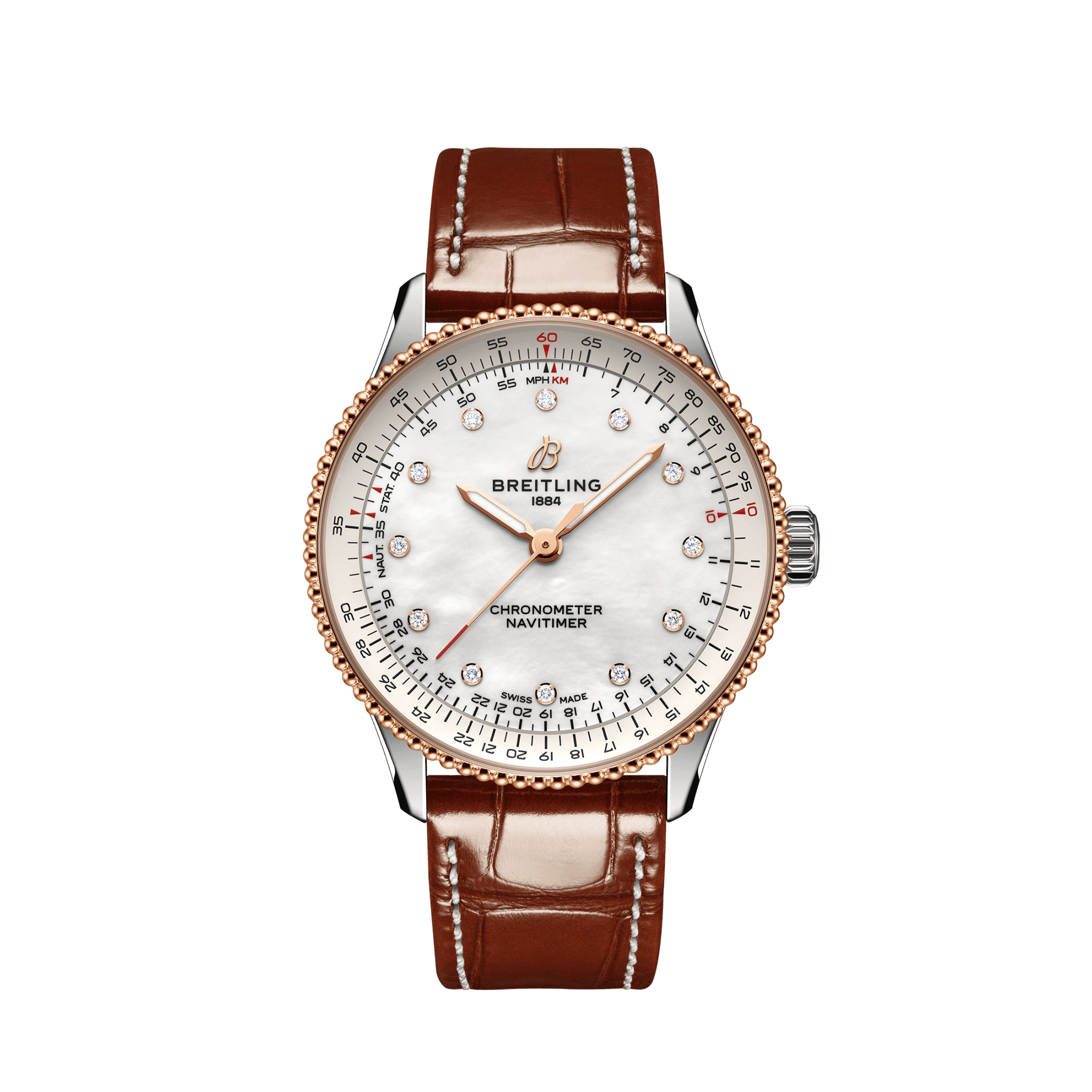 [ SPEC ]掲載されている商品はラインナップのご紹介となっております。カタログ番号 0000003649 サイズ 36mm 文字盤 MOP(マザーオブパール) 機能 3針 インデックス ダイヤモンド ケース素材 ステンレススチール+18Kレッドゴールド ベルト アリゲーターストラップ ベゼル 回転計算尺ベゼル 日付 日付なし 防水性 30M 動力 自動巻き