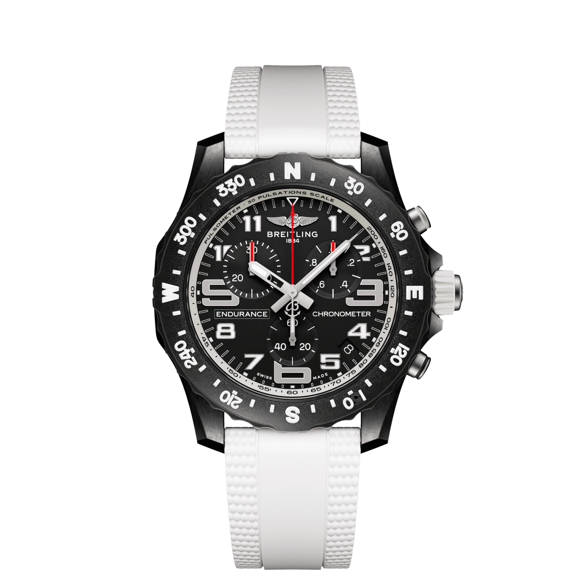 [ SPEC ]掲載されている商品はラインナップのご紹介となっております。カタログ番号 0000005140 サイズ 44mm 文字盤 ホワイト 機能 クロノグラフ インデックス アラビア ケース素材 ブライトライトⓇ ベルト ラバーストラップ ベゼル 回転ベゼル 日付 日付あり 防水性 100M 動力 クォーツ