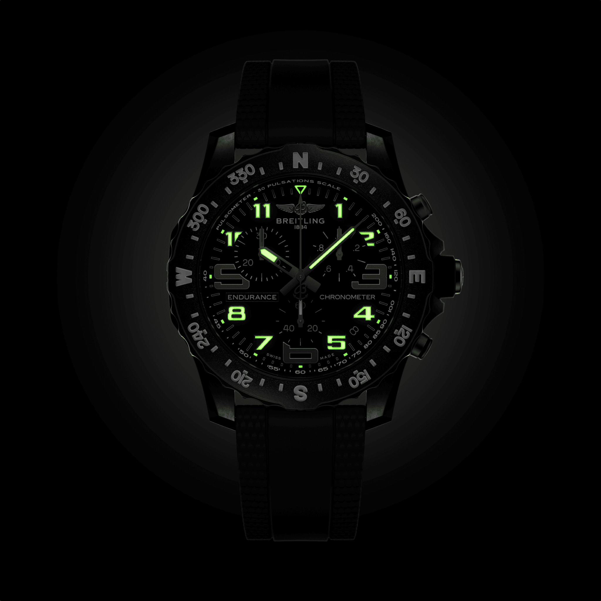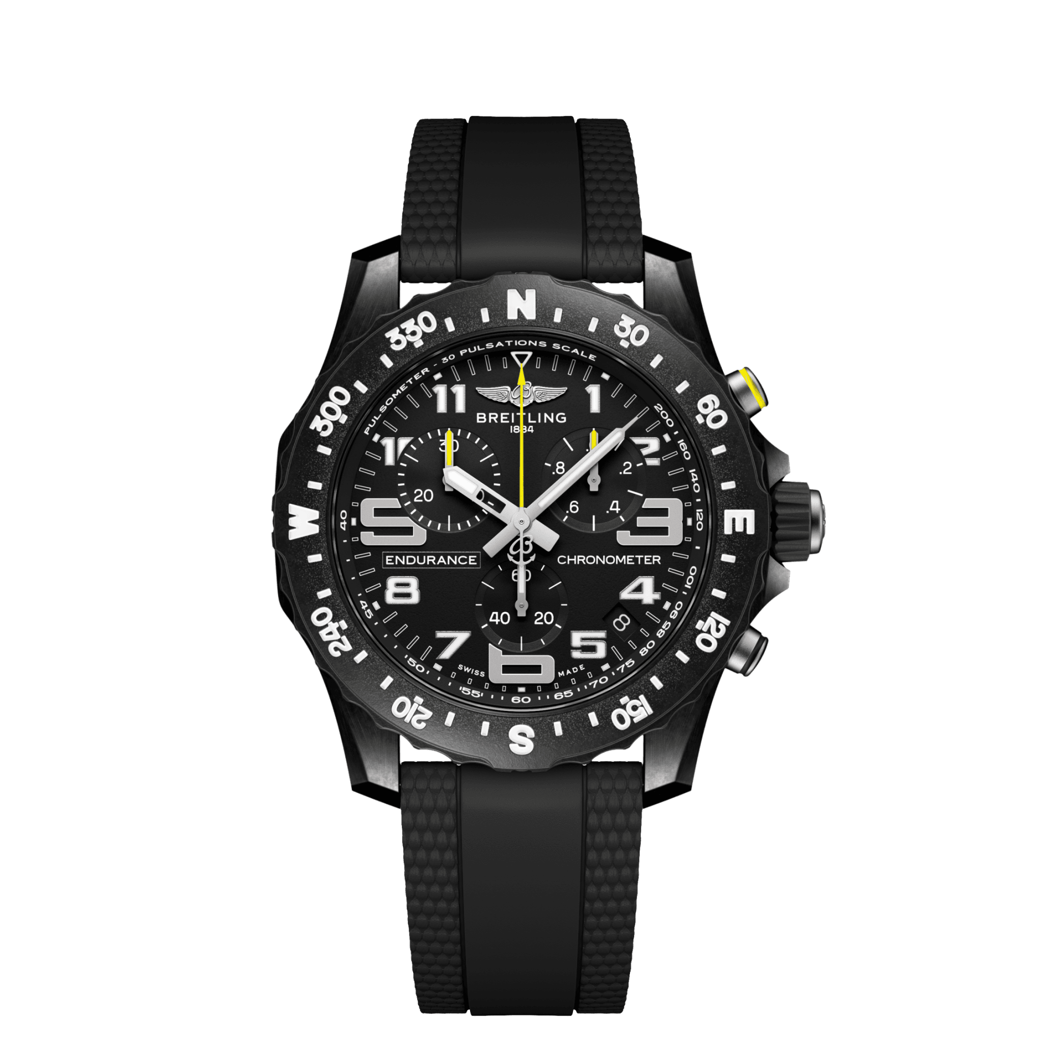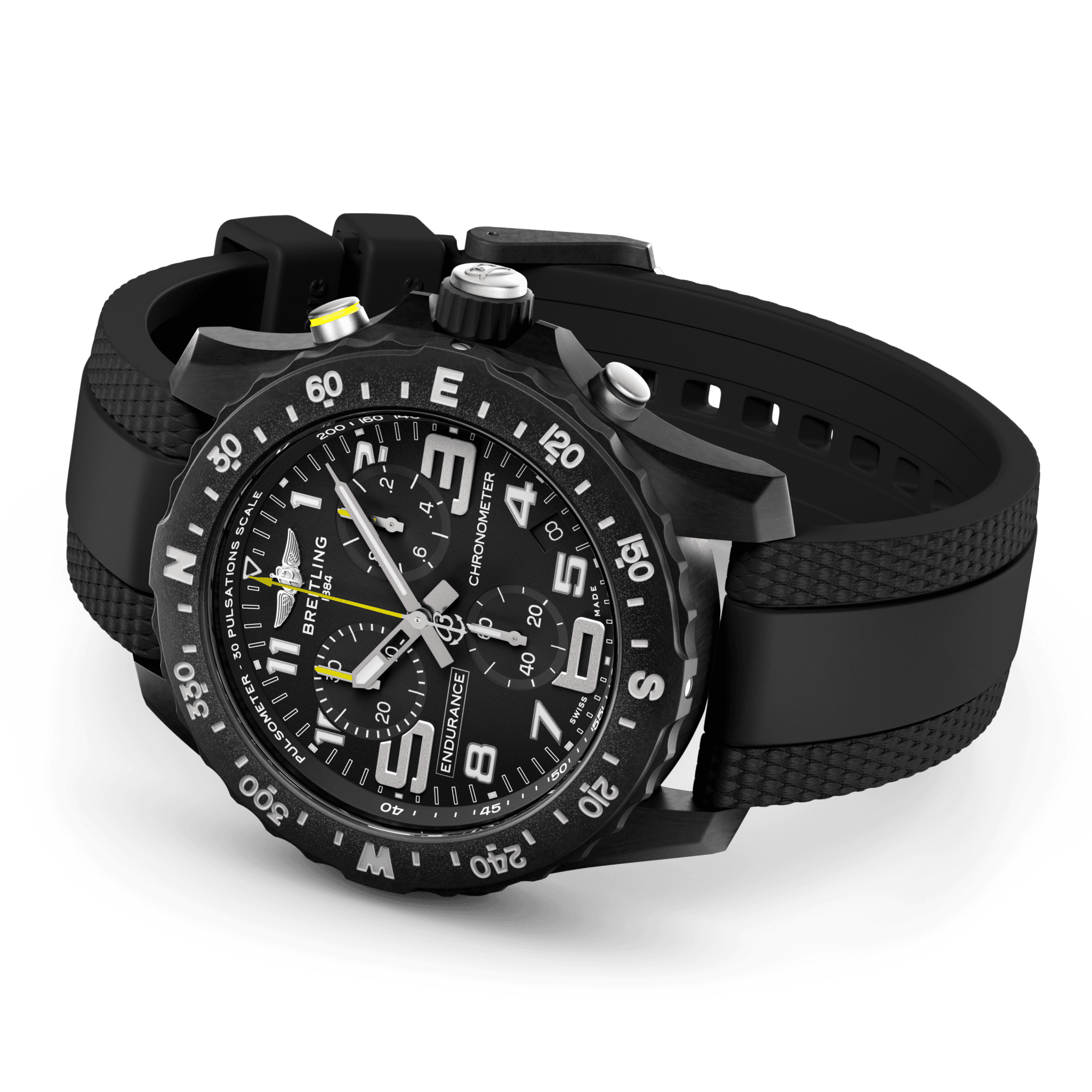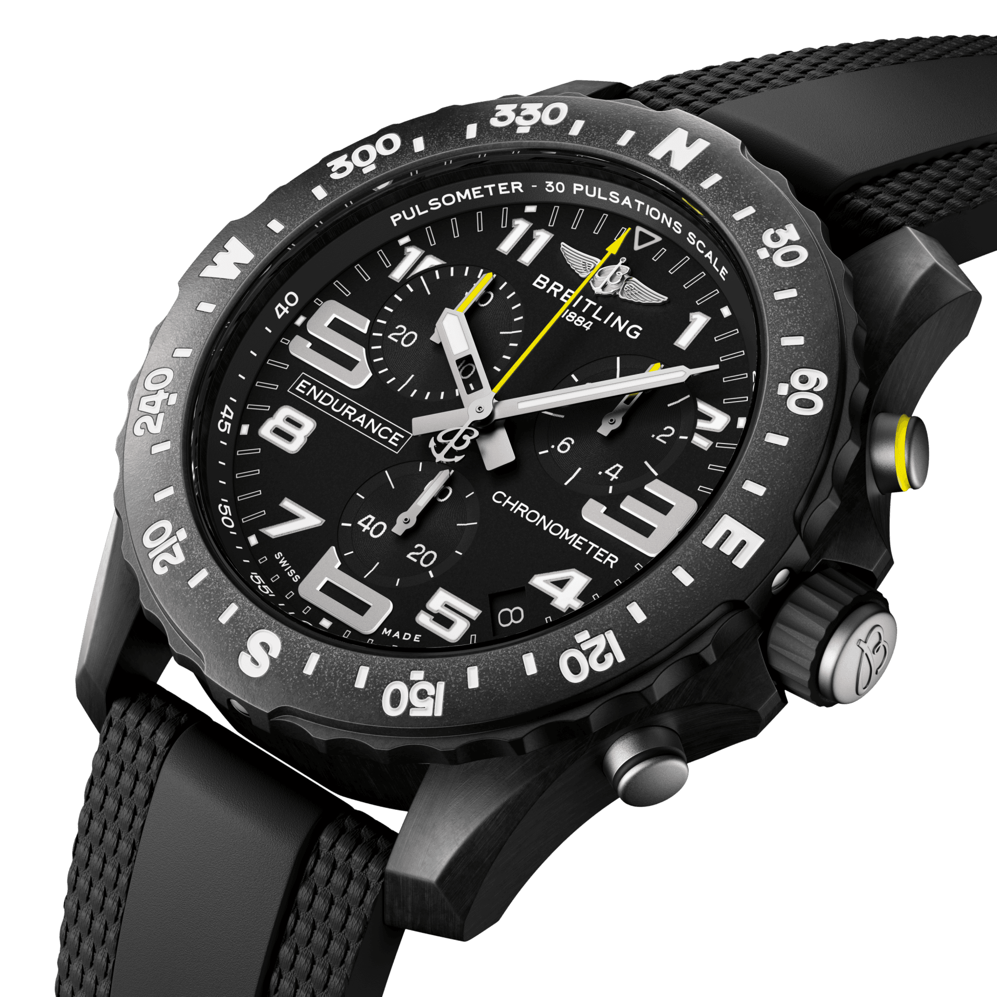 [ SPEC ]カタログ番号 0000006112 サイズ 44mm 文字盤 ブラック 機能 クロノグラフ インデックス アラビア ケース素材 ブライトライトⓇ ベルト ラバーストラップ ベゼル 回転ベゼル 日付 日付あり 防水性 100M 動力 クォーツ アスリート向けの軽量ウォッチ、そしてカジュアルでデイリーなスポーツ用クロノグラフとしてデザインされたエンデュランス プロ。革新的なテクノロジーと色鮮やかなデザインが見事に融合した、究極のアスレジャーウォッチです。 プロ意識とスポーティなライフスタイルを併せ持ち、アクティブな日々を過ごす男女に向けてデザインされたエンデュランス プロは、過酷なワークアウトはもちろん、普段使いでもファッショナブルにお楽しみいただけます。 エンデュランス プロの特徴は、超軽量のブライトライト®製ケース。チタンの3.3倍、ステンレススチールの5.8倍も軽い頑丈な素材です。非磁性、熱安定性、低刺激性のブライトライト®は、傷、摩擦、腐食に対しても高い耐性があります。メタルよりも温かい触感と軽いテクスチャード効果が、デザインの独創性を際立たせています。ブライトリング専用、100%スイス製の素材を使用。 サイズは44 mmまたは38 mm(ブライトライト®穴留め式バックル付き)の2種類、カラフルなダイヤルとラバーストラップを採用した、アスリートにおすすめのモデルです。2つのサイズはそれぞれブライトリングのキャリバー82と32で駆動、どちらもCOSC公認スーパークォーツ™クロノグラフで、卓越した精度を誇ります。掲載されている商品はラインナップのご紹介となっております。