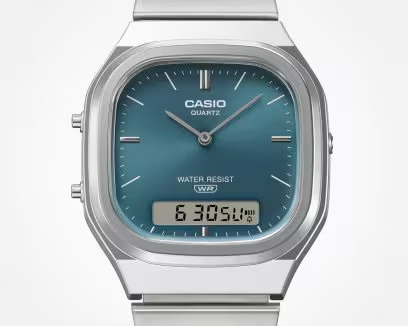 角型フェイスにアナログ時計とデジタル表示を組み合わせ、丸みのあるケース形状を採用しています。曲線を基調としたデザインが洗練された印象に。