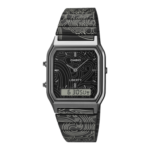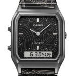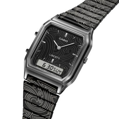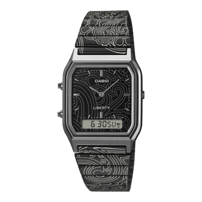 ベースモデルには角型フェイスにアナログ時計とデジタル表示を組み合わせた人気のAQ-230を採用。リバティの代表的なペイズリーファンファーレにインスパイアされ、曲線が美しいクラシックなペイズリー柄をバンドと文字板にデザインしました。 レーザー刻印によって緻密に表現された柄が、繊細な美しさを添えています。