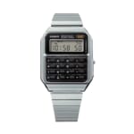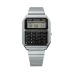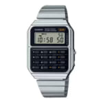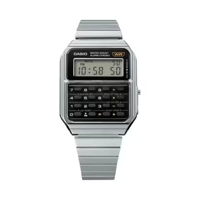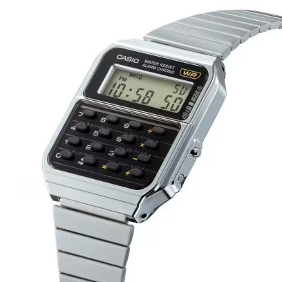 カシオのアイコニックな電卓デザインをモチーフにしたシリーズから、メタリックケースを採用したモデルです。8桁計算機能のほかに、デュアルタイム、ストップウオッチ等便利で多彩な機能を備えています。