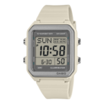 視認性に優れたワイドスクリーンと曜日表示にはピクセルフォントを採用し、レトロな味わいを残しつつ見やすさを向上させています。バンドの取り付け部にはフラットなストライプパターンを施し、シンプルながらもアクセントの効いたデザインです。