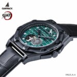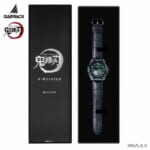 文字盤には竃門炭治郎の羽織をイメージした、緑と黒に着色された銀箔が鮮やかに輝きます。1秒ごとに回転するディスクは日輪刀の鍔を、時計の針は日輪刀と鞘をイメージしデザインしています。12時位置のインデックスにはアクセントとして鎹鴉が配置されています。