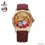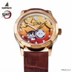 文字盤には我妻善逸の羽織をイメージした、黄色に着色された銀箔が鮮やかに輝きます。1秒ごとに回転するディスクは日輪刀の鍔を、時計の針は日輪刀と鞘をイメージしデザインしています。12時位置のインデックスにはアクセントとしてチュン太郎が配置されています。