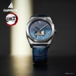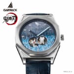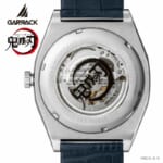 文字盤には時透無一郎の髪の色をイメージした、グラデーションが美しい銀箔が鮮やかに輝きます。1秒ごとに回転するディスクは日輪刀の鍔を、時計の針は日輪刀をイメージしデザインしています。12時位置のインデックスにはアクセントとして鎹鴉が配置されています。