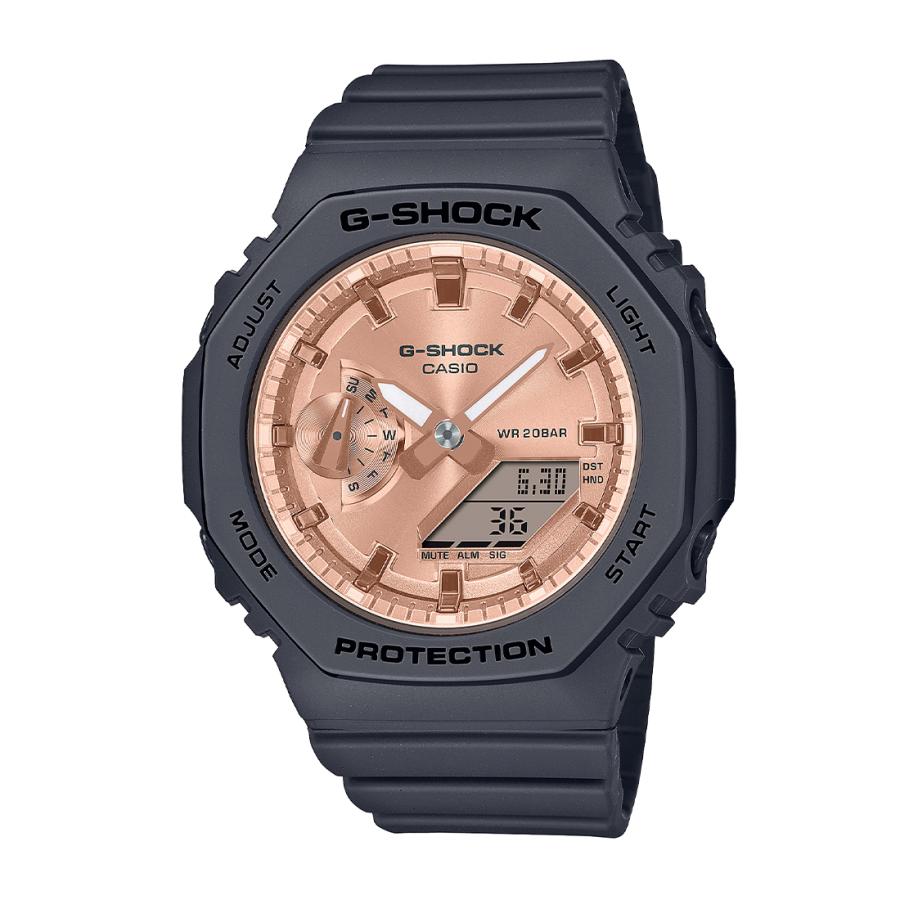 ベースモデルのGA-2100はG-SHOCKの初代モデルDW-5000Cの八角形フォルムを継承し薄型化したモデル。フラットなフェイスとシンプルなバーインデックスがシンプルながらもソリッドな印象に演出しています。