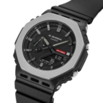 シンプルさと機能美の共存を目指し、無彩色のカラースキームを採用。G-SHOCKの耐衝撃性を象徴するメタルの八角ベゼルには、モダンインダストリアルデザインでも多く見られるチェッカリングパターンを施し、メタルベゼルや機能表示をマーキングした赤いアクセントカラーが機能性を豊かに表現しています。