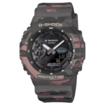 オリジナルのG-SHOCKカモフラージュパターンは、ブランドの象徴である「G」の文字を巧みに隠し込んだユニークかつ大胆なデザインが特徴。カモフラージュ部分にはメタリックプリントを施し洗練された雰囲気を演出しています。また、ダイアルにもカモフラージュ柄を蒸着処理することで一層カモフラージュ感を高めています。