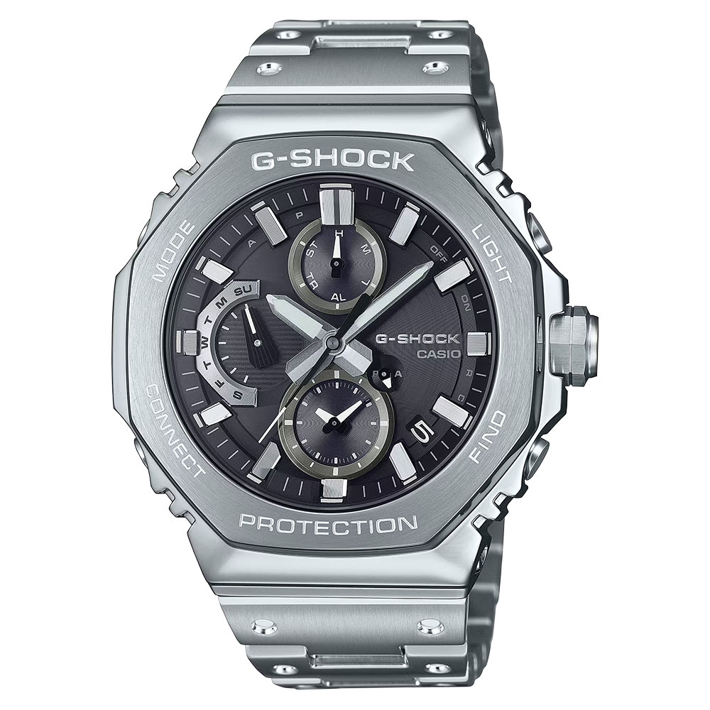 [ SPEC ]カタログ番号 0000005606 サイズ 46.3mm 文字盤 ブラック 機能 ワールドタイム インデックス バー ケース素材 ステンレススチール ベルト ブレスレット ベゼル ノーマル 日付 日付あり 防水性 200M 動力 ソーラー G-SHOCK初代モデル“DW-5000C”のコンセプトを受け継いで開発されたアナログ「2100」シリーズのフルメタルクロノグラフです。ケース、ベゼル、バンドにステンレススチールを採用しながら、1983年に誕生したDW-5000Cにも採用された八角形のベゼル形状や、バンドのディンプルデザインを継承しています。掲載されている商品はラインナップのご紹介となっております。