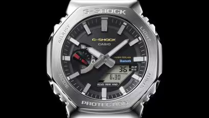 ベゼルとケースの間にはファインレジン製の緩衝材を実装。また、バンド接続部を3本足構造とし、連結パイプに加わる衝撃を分散。メタル製のバンドピースにディンプル加工を施し、初号機の樹脂バンドデザインを継承しました。