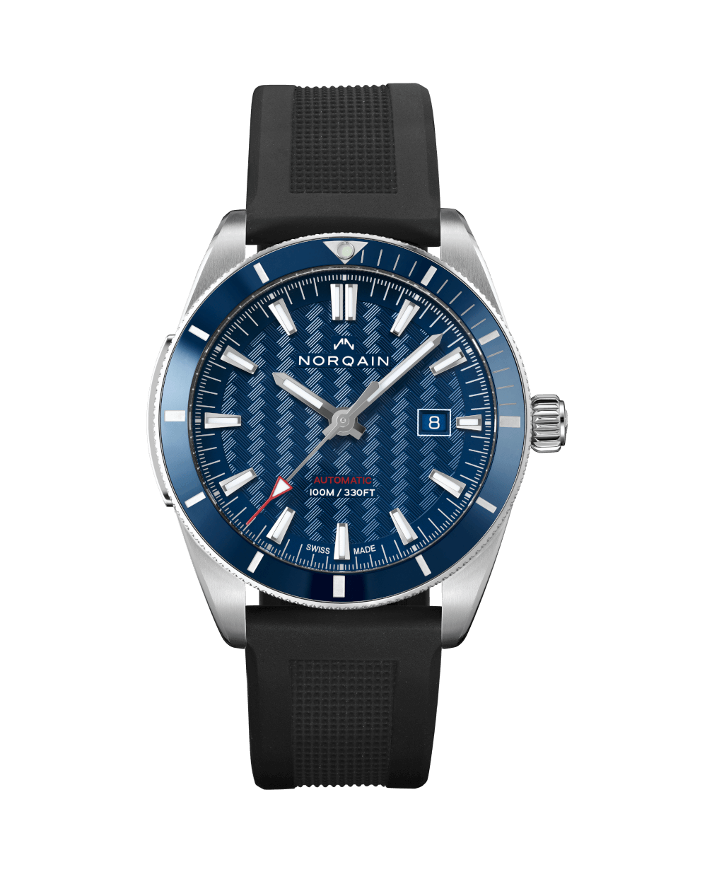 [ SPEC ]掲載されている商品はラインナップのご紹介となっております。カタログ番号 143875 サイズ 42mm 文字盤 ブルー 機能 3針・バックスケルトン インデックス バー ケース素材 ステンレススチール ベルト ラバーストラップ ベゼル 逆回転防止ベゼル 日付 日付あり 防水性 100M 動力 自動巻き