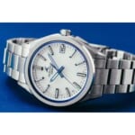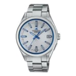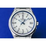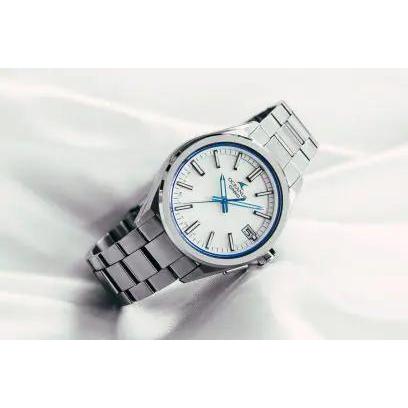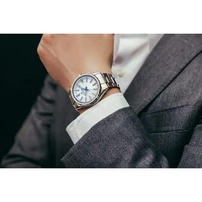 シンプルで洗練された3針フェイスに、青が際立つホワイト蒸着文字板で、外装にはステンレスを採用。フラットベゼルでビジネススタイルにも合わせやすい仕上げとしました。風防は反射防止コーティングサファイアガラスです。