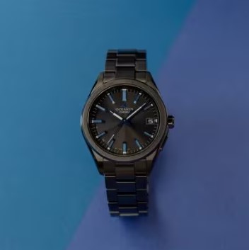 シンプルで洗練された3針フェイスに、ブラックIP加工を施したオールブラックのモデルをラインアップ。時字と針にはブルーを用い、オールブラックの中にアクセントとしてブランドカラーであるブルーがより際立つ精悍なデザインを実現。外装にはステンレスを採用し、フラットベゼルでカジュアル化が進むビジネススタイルにも合わせやすい仕上げとしました。風防は反射防止コーティングサファイアガラスを採用。