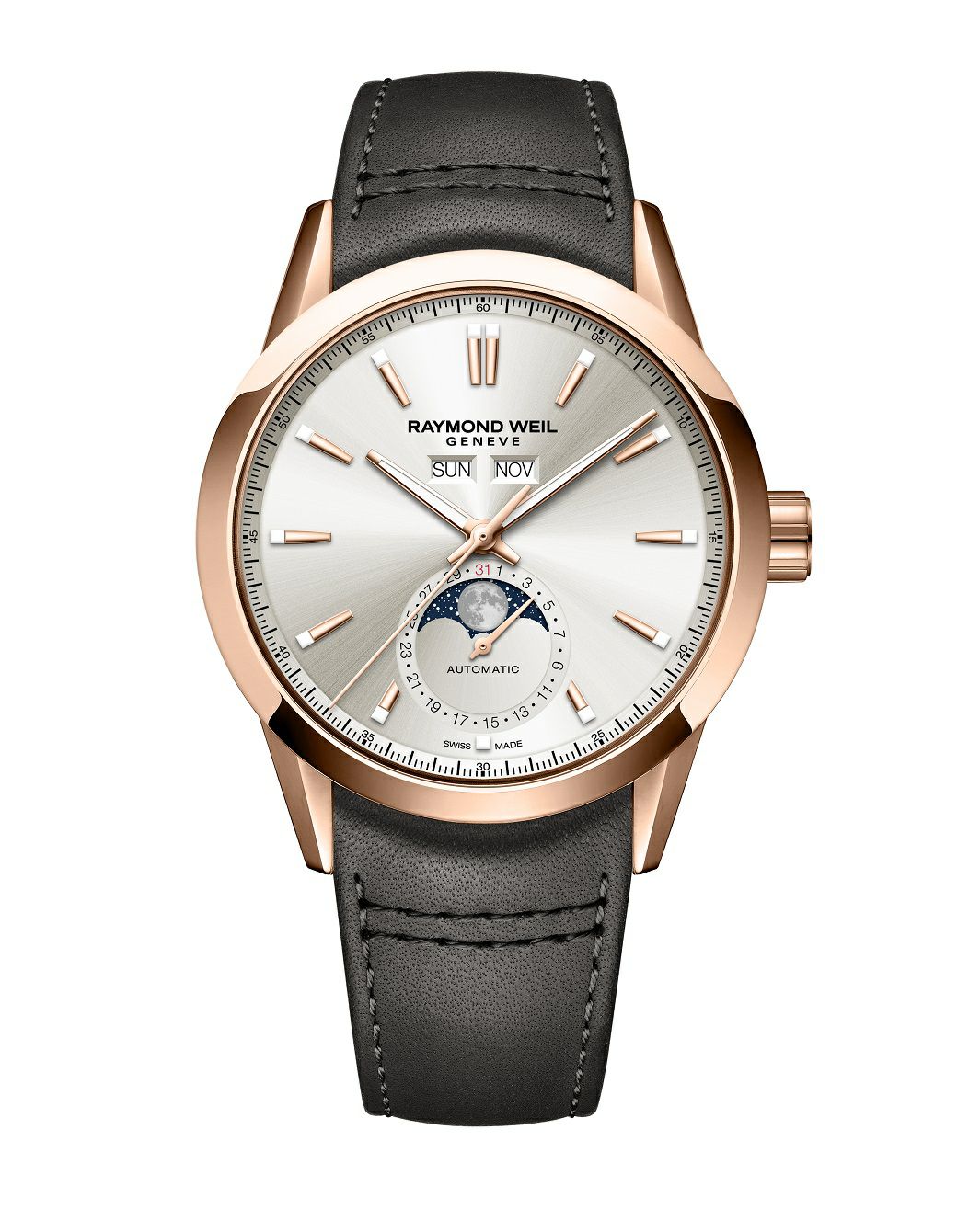 [ SPEC ]掲載されている商品はラインナップのご紹介となっております。カタログ番号 0000007213 サイズ 40.0mm 文字盤 シルバー 機能 3針・ムーンフェイズ インデックス バー ケース素材 ローズゴールドPVD ベルト カーフストラップ ベゼル ノーマル 日付 トリプルカレンダー 防水性 100M 動力 自動巻き