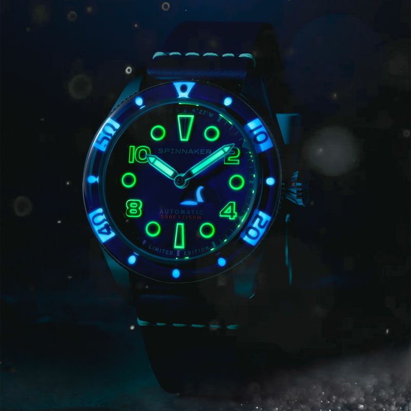 ミステリアスなシーンは、夜にも訪れます。針とインデックスには発光量に優れたスイス製の蓄光塗料を塗布し、暗所でも優れた視認性を確保。しかも針の裏面にも塗布されており、その光がマザー・オブ・パールのダイヤルに反射することで、いっそう謎めいた光景が映し出されます。ネッシーのシルエットやベゼルには光量が控えめな蓄光塗料が塗布され、神秘的な姿を演出します。