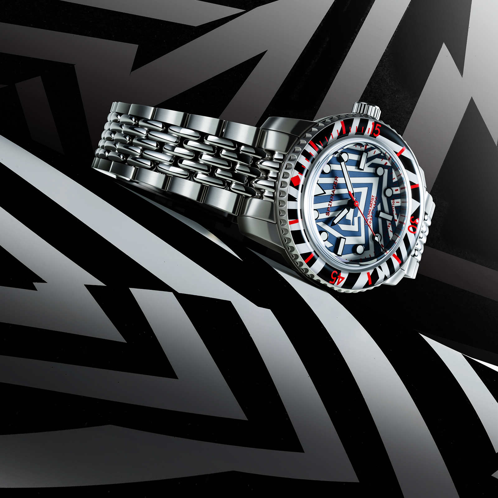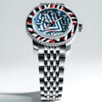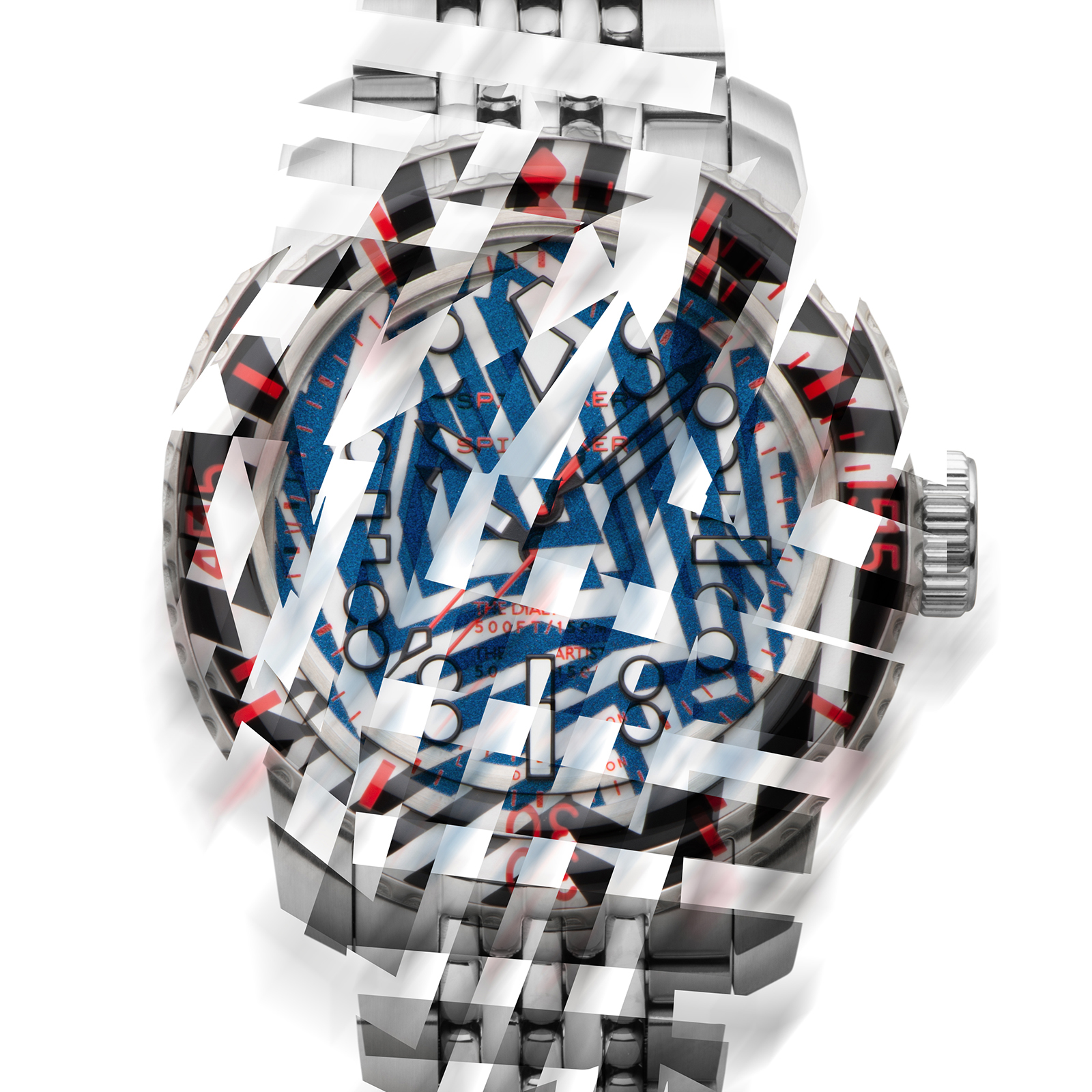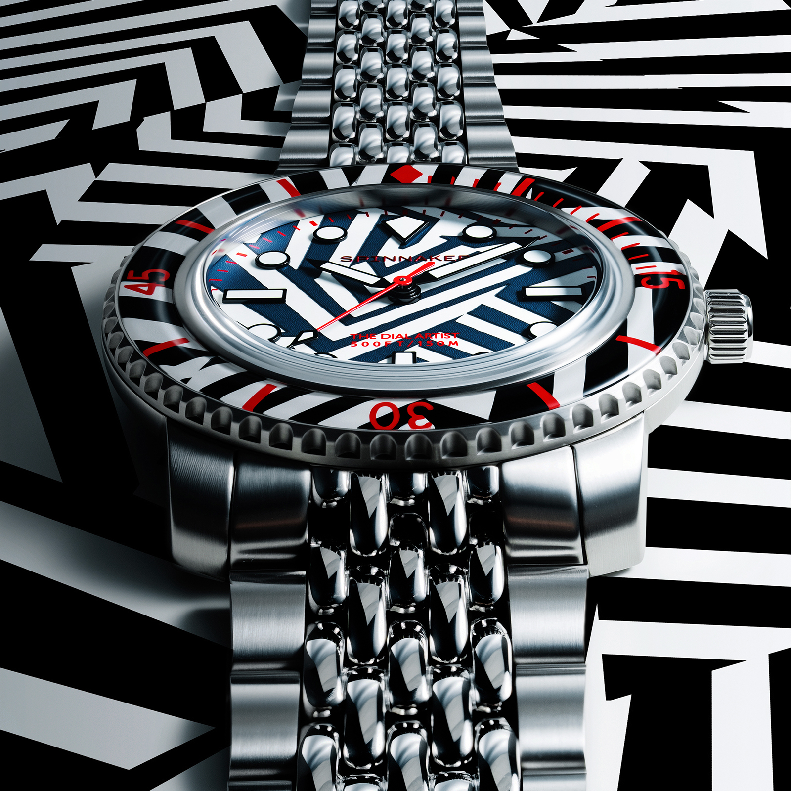 シンプルなバトン針や、バーとドットを組み合わせたインデックスは、ラズル・ダズル迷彩の幾何学模様と高い親和性を持ち、見る者を幻惑。秒針やロゴ、ベゼルの目盛りに用いた鮮烈なレッドカラーは、強烈なインパクトを与えた上で迷彩効果を果たそうという、このパターンらしい配色です。6時位置には、デザイナーであるクリス・アレクサンダーの異名「THE DIAL ARTST」が刻印されています。