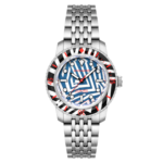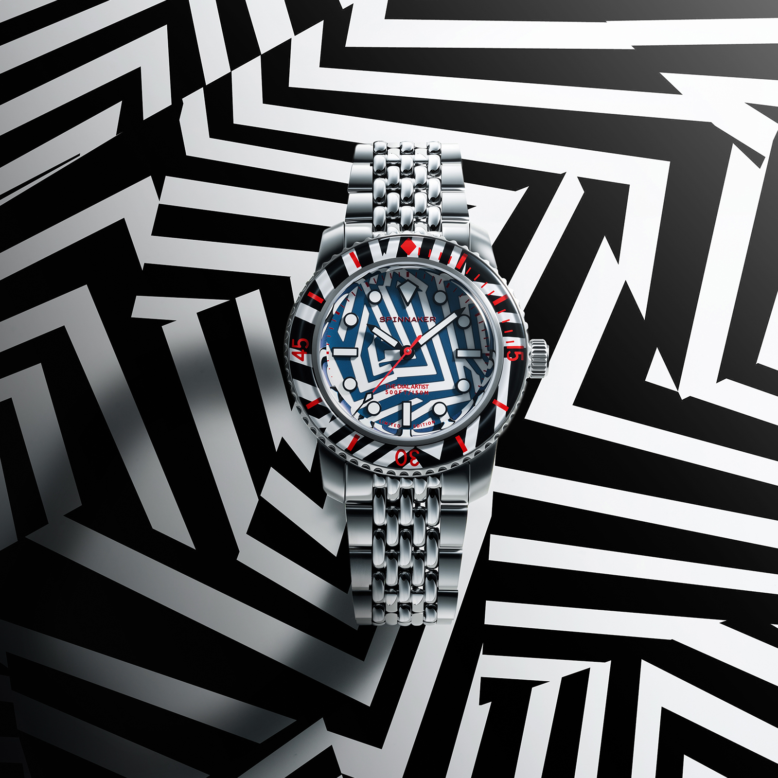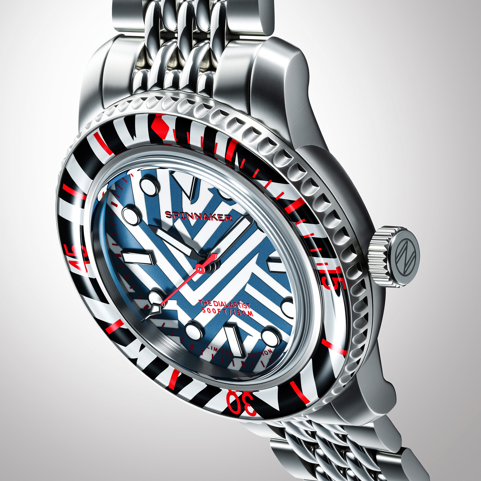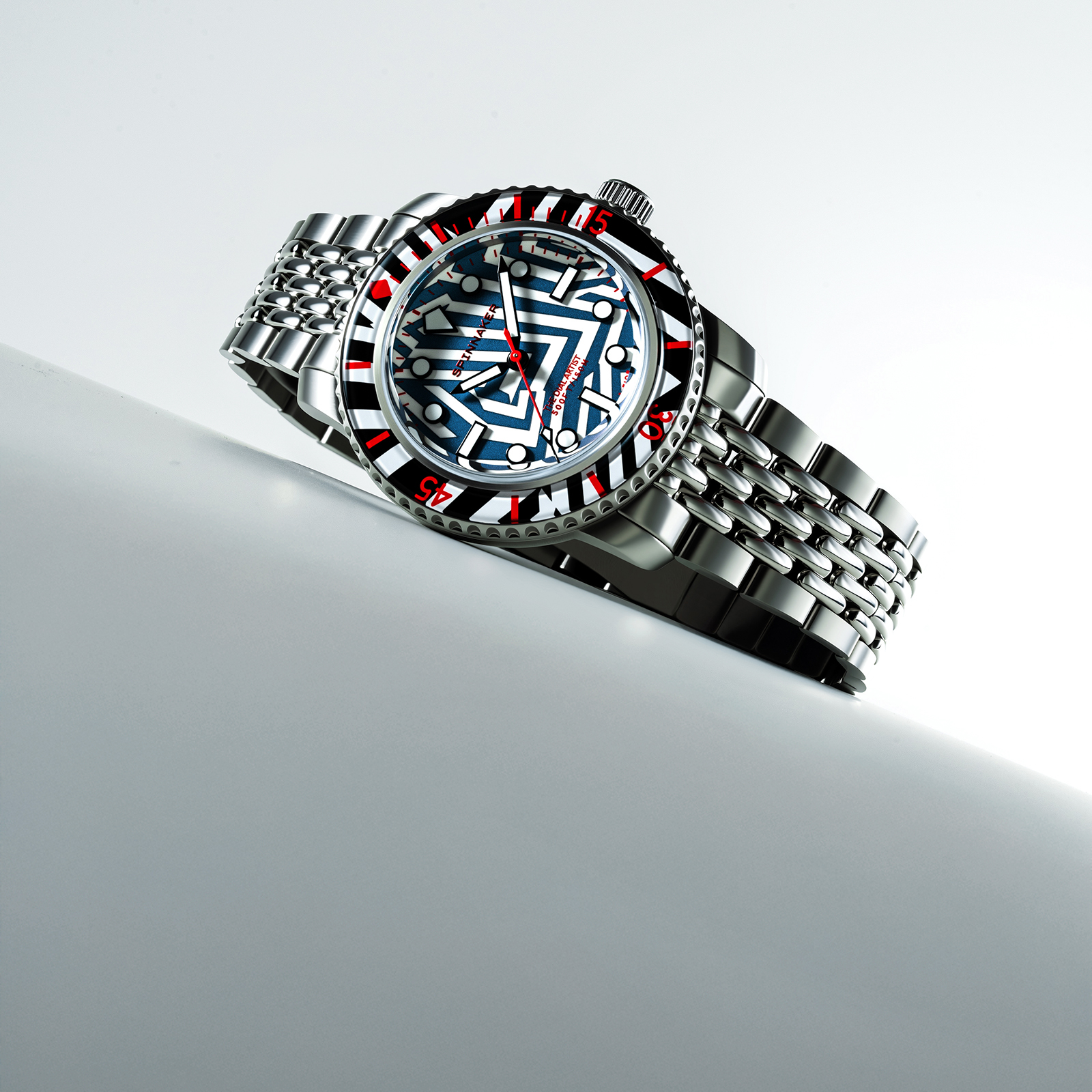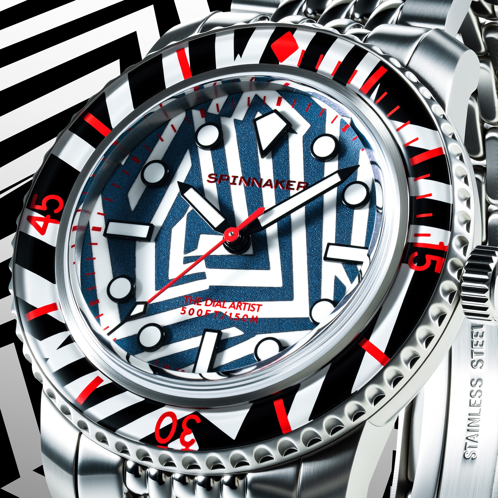 シンプルなバトン針や、バーとドットを組み合わせたインデックスは、ラズル・ダズル迷彩の幾何学模様と高い親和性を持ち、見る者を幻惑。秒針やロゴ、ベゼルの目盛りに用いた鮮烈なレッドカラーは、強烈なインパクトを与えた上で迷彩効果を果たそうという、このパターンらしい配色です。6時位置には、デザイナーであるクリス・アレクサンダーの異名「THE DIAL ARTST」が刻印されています。