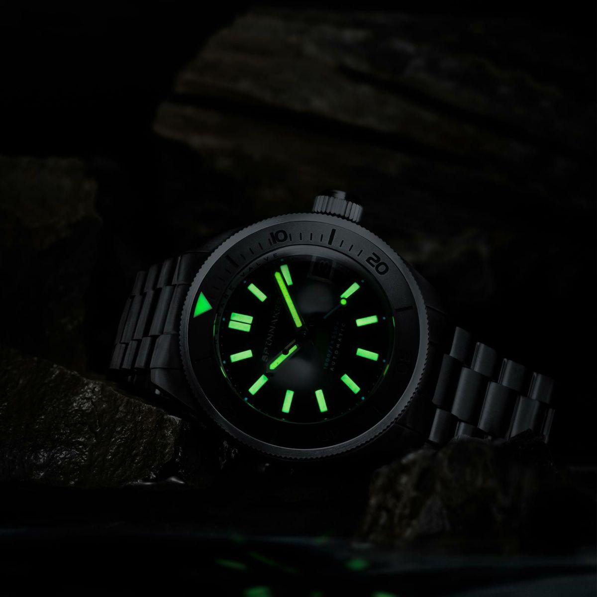 太いバー状のインデックスには、視認性を高めるためスーパールミノバを塗布。暗闇で強く発光すします。発光時間が長く、暗い場所でもしっかりと時刻確認できます。