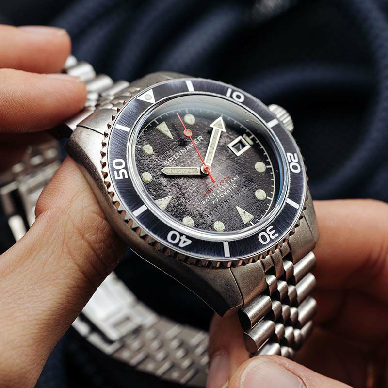 文字盤や針、ケース、ブレスレット、インデックスなど、随所にビンテージウォッチを彷彿とさせるユーズド加工を施しました。