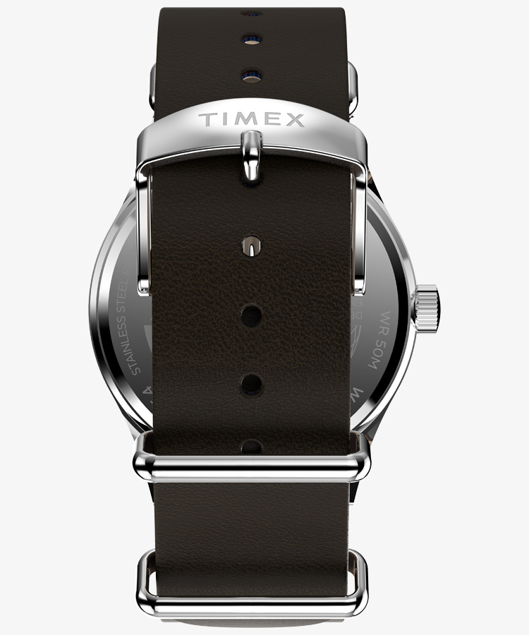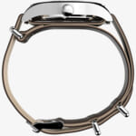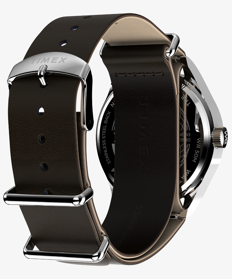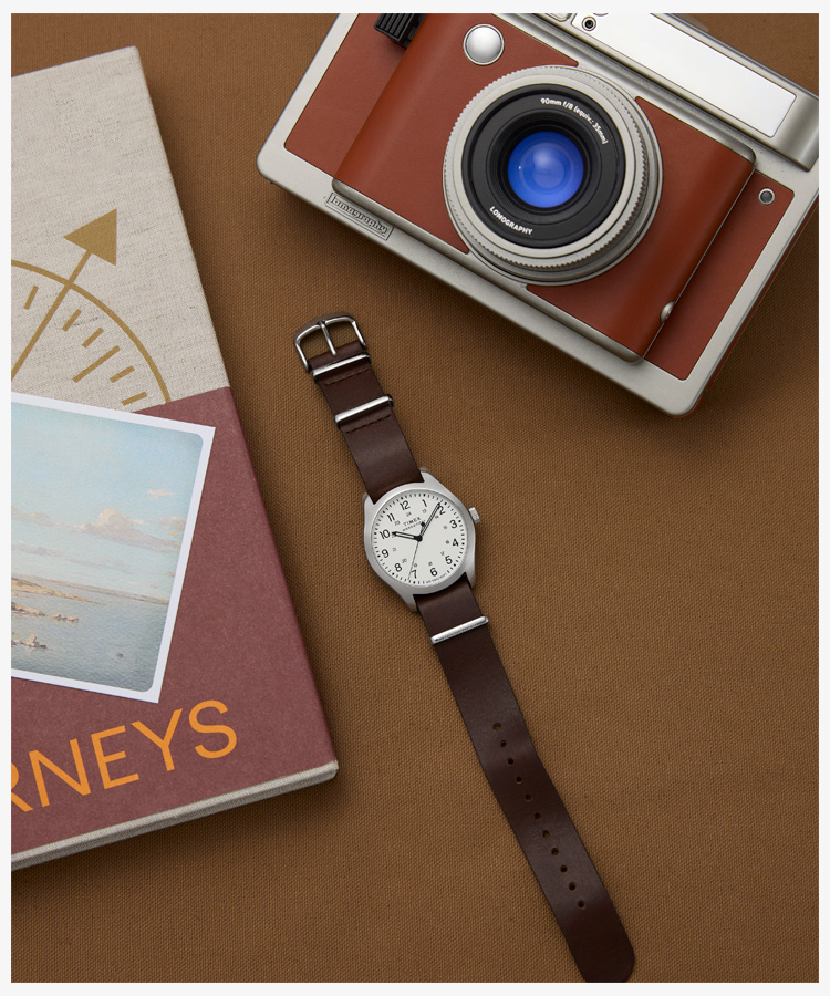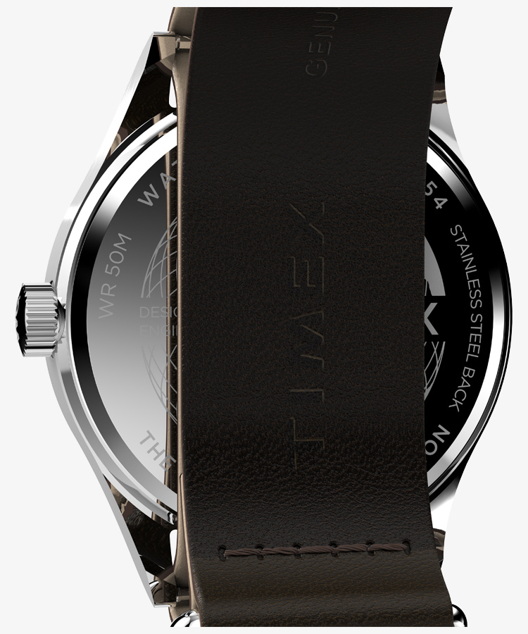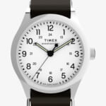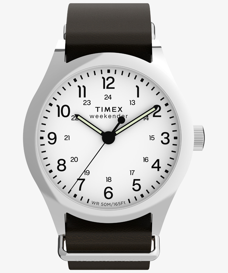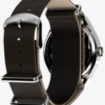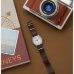 39mmのスリムなステンレススチールケースには、清潔感のあるホワイトの文字盤が合わせられ、12時間と24時間表示のインデックス、そして暗くなっても時刻を確認しやすい蓄光針を搭載しています。