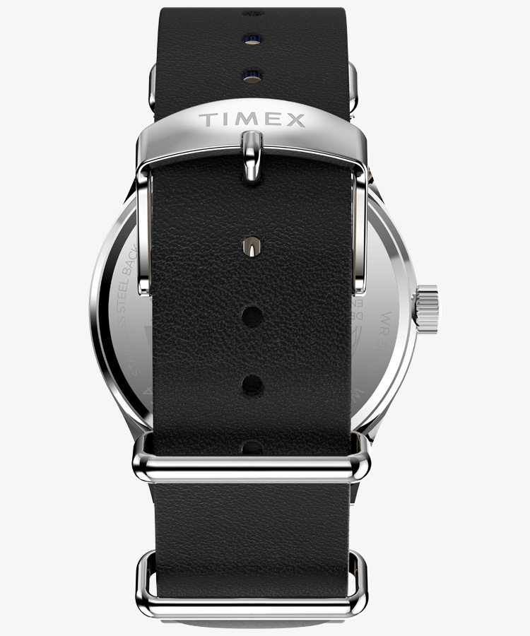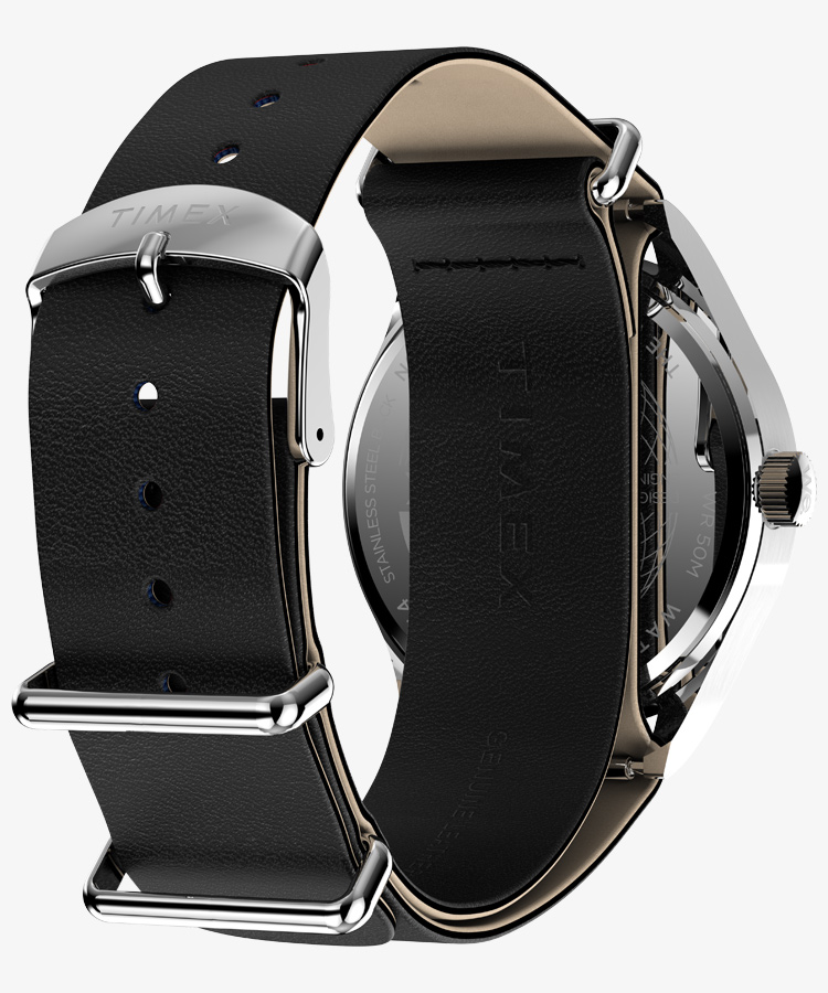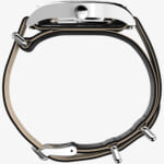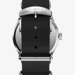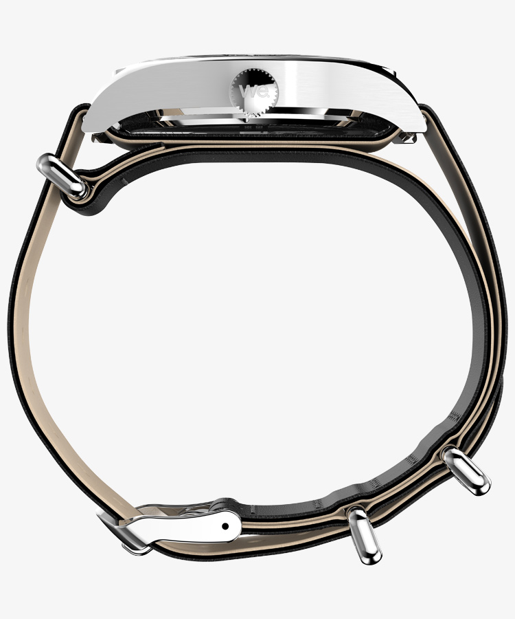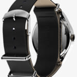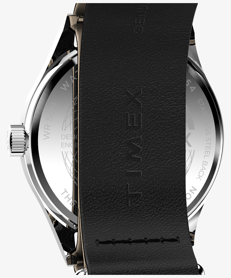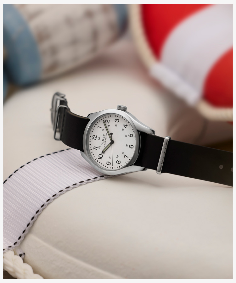 39mmのスリムなステンレススチールケースには、清潔感のあるホワイトの文字盤が合わせられ、12時間と24時間表示のインデックス、そして暗くなっても時刻を確認しやすい蓄光針を搭載しています。