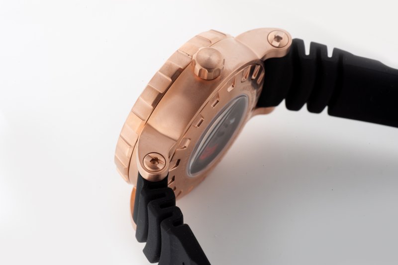 [ SPEC ]掲載されている商品はラインナップのご紹介となっております。カタログ番号 0000000942 サイズ 45.7mm 文字盤 ブラック 機能 3針・バックスケルトン インデックス ドット ケース素材 ローズゴールドPVD ベルト ラバーストラップ ベゼル 逆回転防止ベゼル 日付 日付なし 防水性 300M 動力 自動巻き