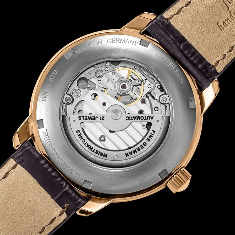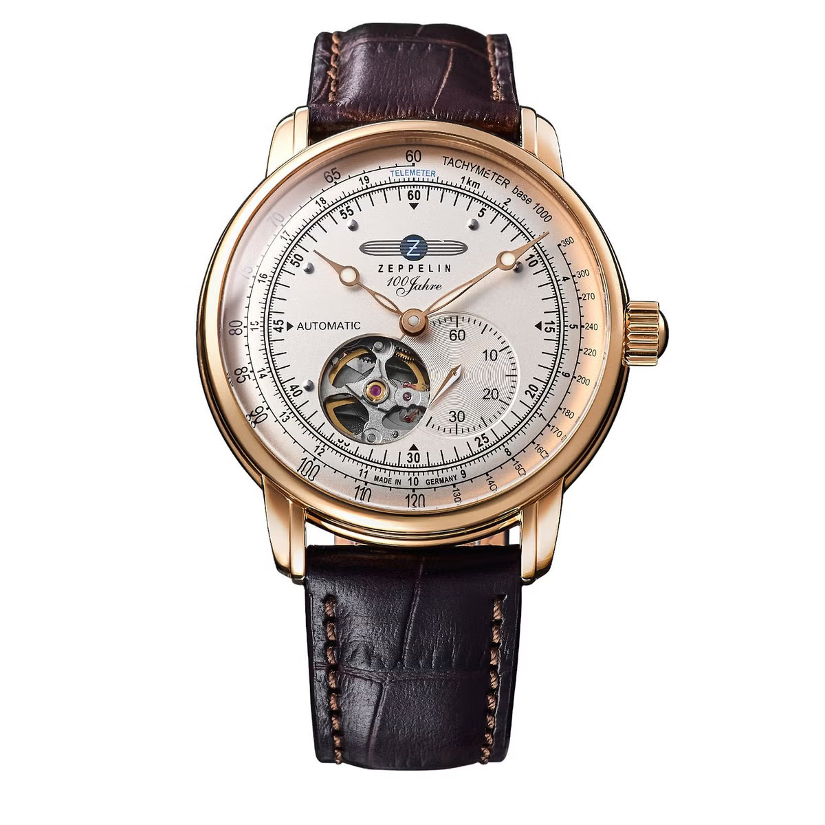 ツェッペリンの新作「100周年記念シリーズ オープンハート オートマティック 7662-8」は、こうした1930年代の空の旅の世界観を表現しました。ゴールドカラーのケースには、かつて空を旅した人々の品格と、時代を超えて受け継がれるクラシックな美意識が息づいています。
