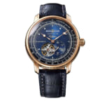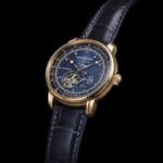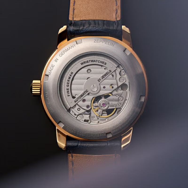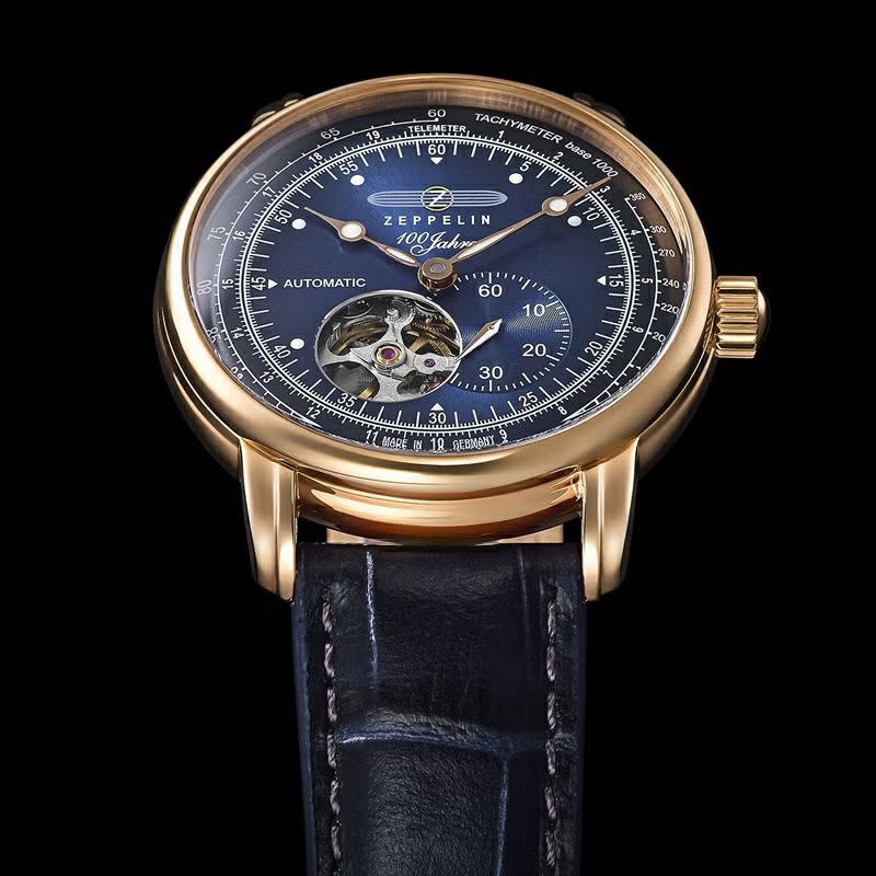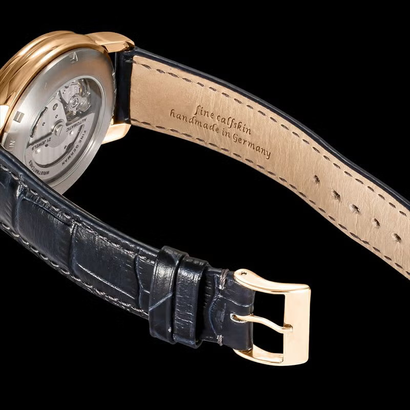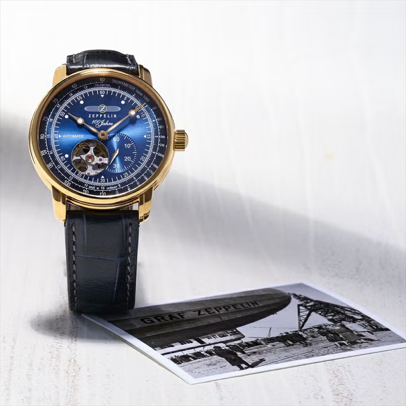この限定モデルは、文字盤に深みのあるネイビーを採用しました。LZ127号が目の当たりにした深く美しいブルーをイメージして作られています。カーフレザーストラップも同じくネイビーで仕上げ、ゴールドと美しいコントラストを描きます。