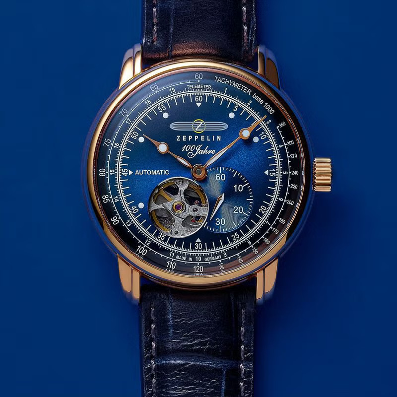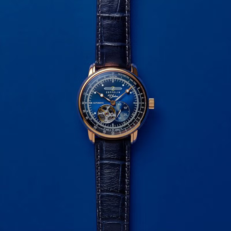 フォルムの着想源は飛行船。大きく膨らんだ躯体を連想させるケースフォルムや、丸みを帯びたボンベダイヤル、「ツェッペリンケース」の愛称をもつベゼルレスケースには、世界で称賛されるツェッペリン「100周年記念シリーズ」ならではのデザインコードが宿っています。